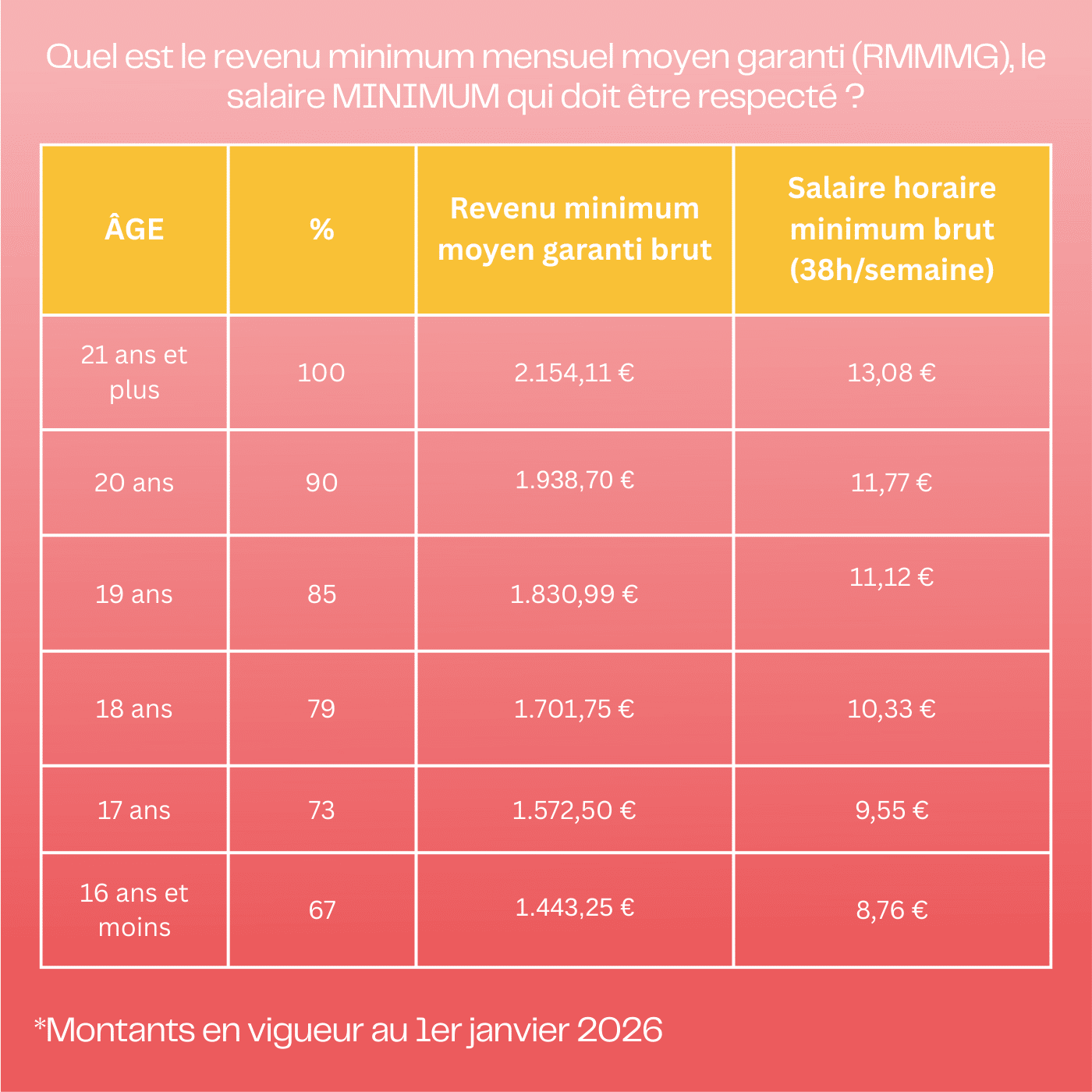 – S’il n’existe aucun barème spécifique dans ton secteur et que tu es engagé·e pour une période d’au moins un mois calendrier, alors tu as droit au revenu minimum mensuel moyen garanti (RMMMG), qui varie en fonction de ton âge.